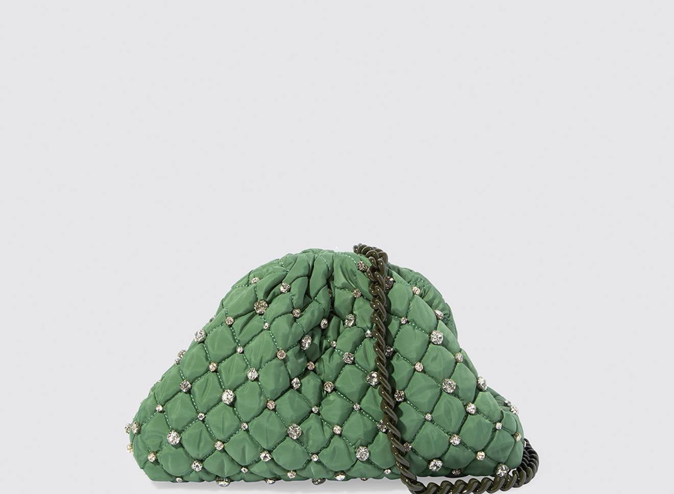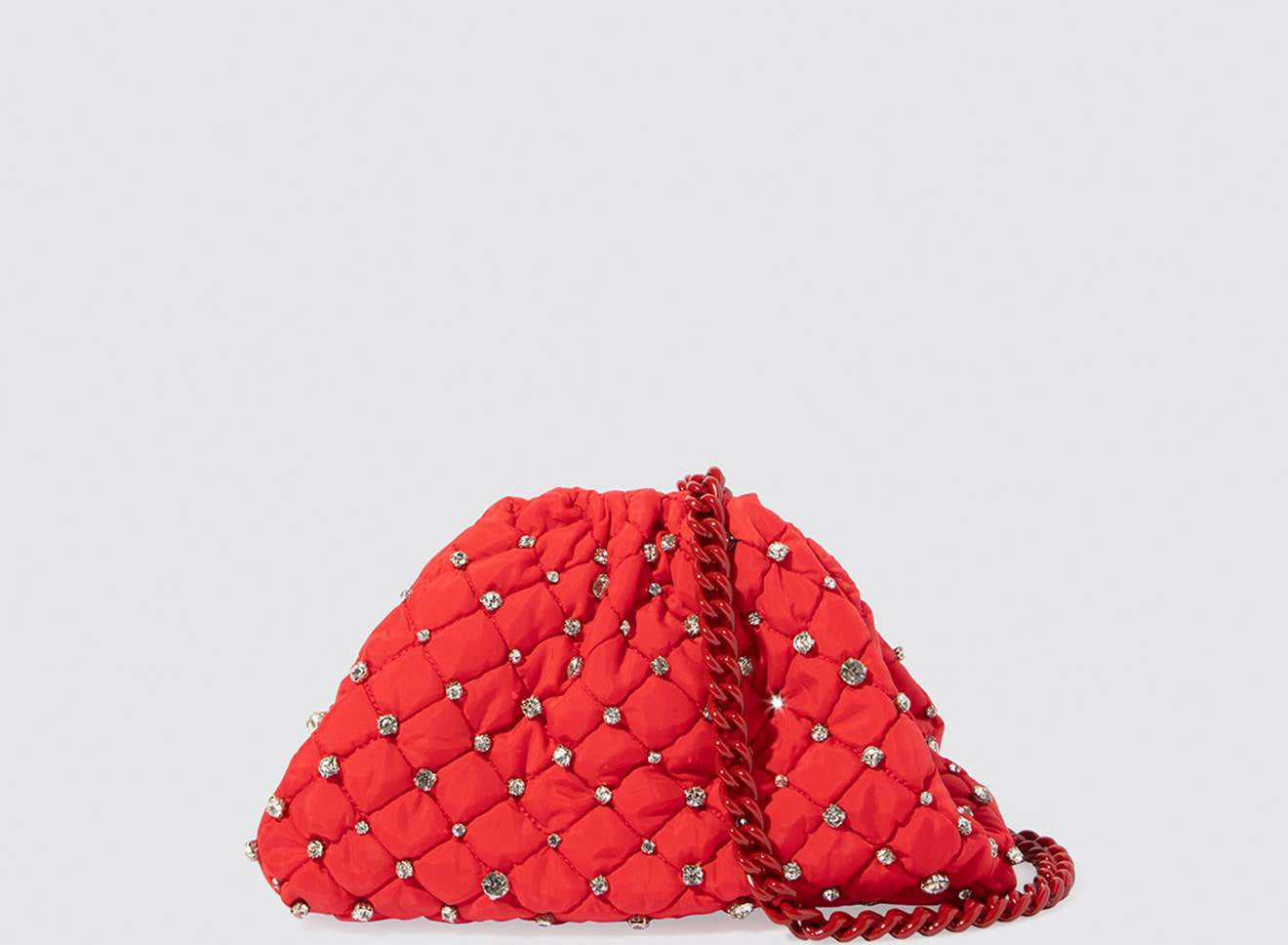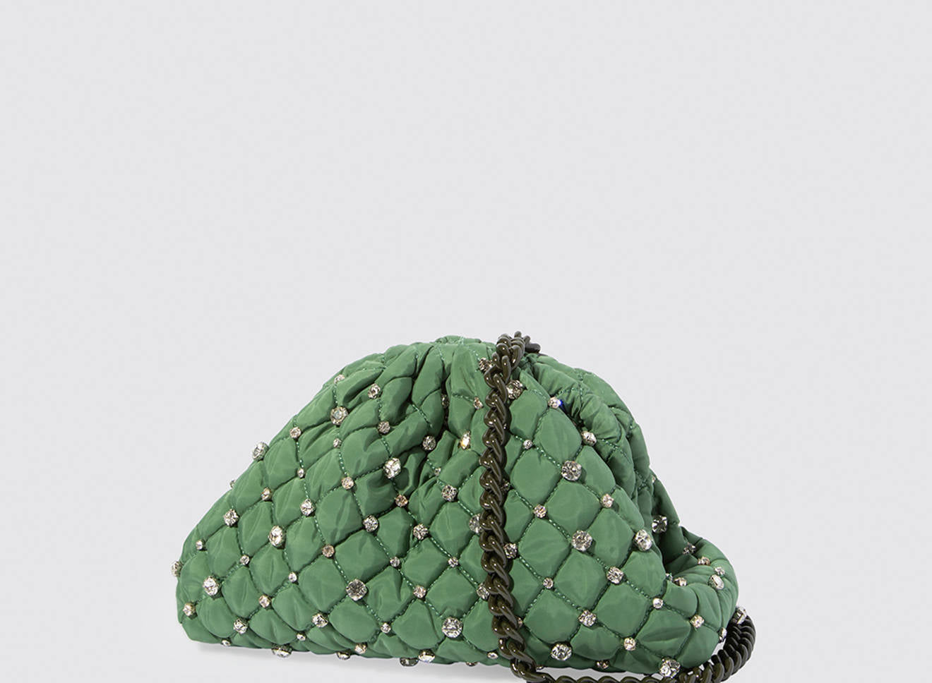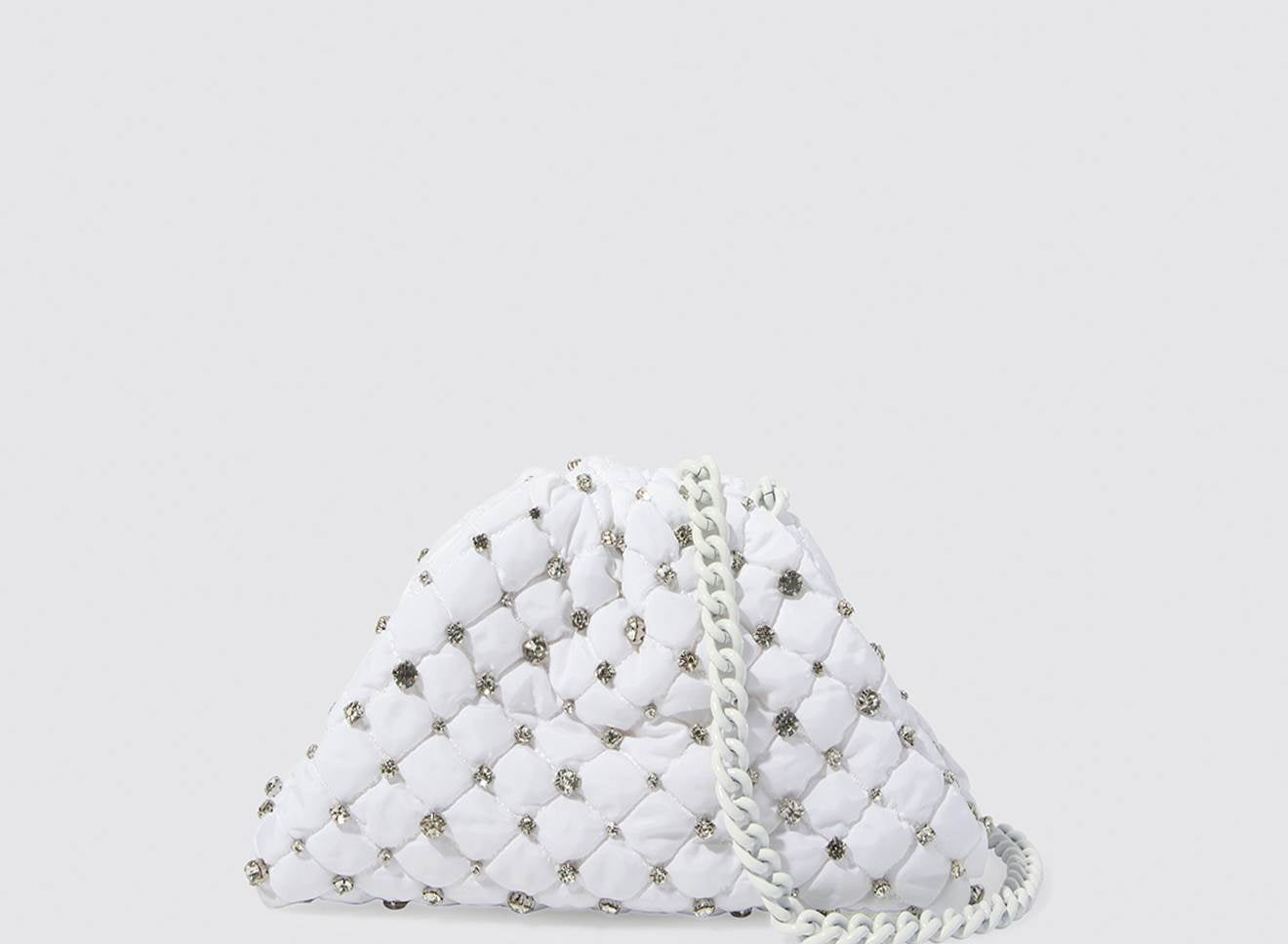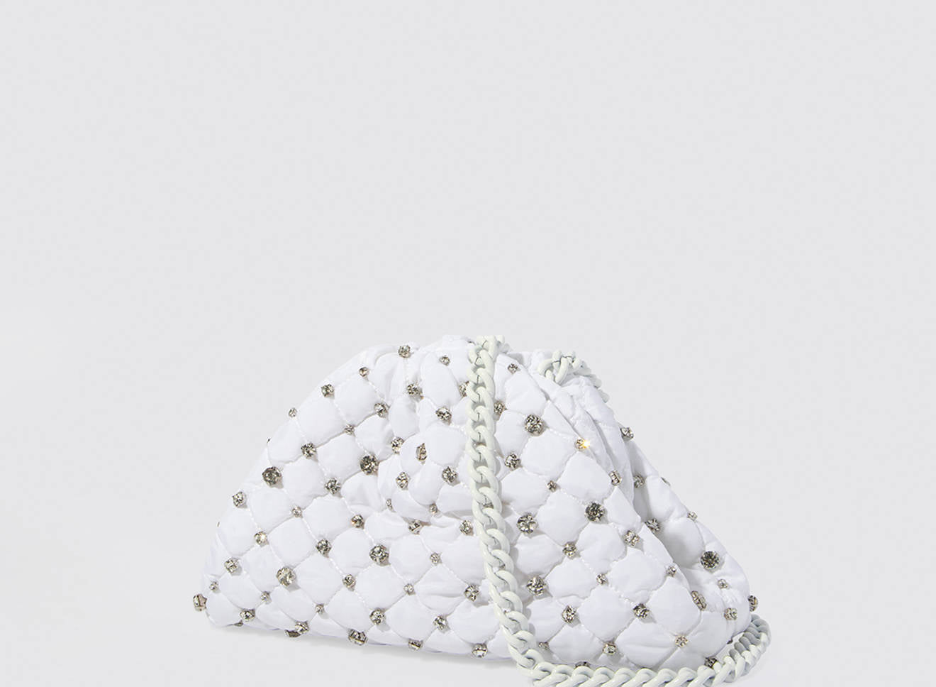 Clutch da donna di piccole dimensioni in tessuto matelassè con strass ricamati a mano. Questa inedita versione ridotta dell’icon bag Maria La Rosa, è capiente quanto basta per portare con sé l'essenziale. Perfetta per la stagione invernale, costituisce l’emblema di una nuova eleganza metropolitana. È dotata di catena ton sur ton per indossarla anche a tracolla.