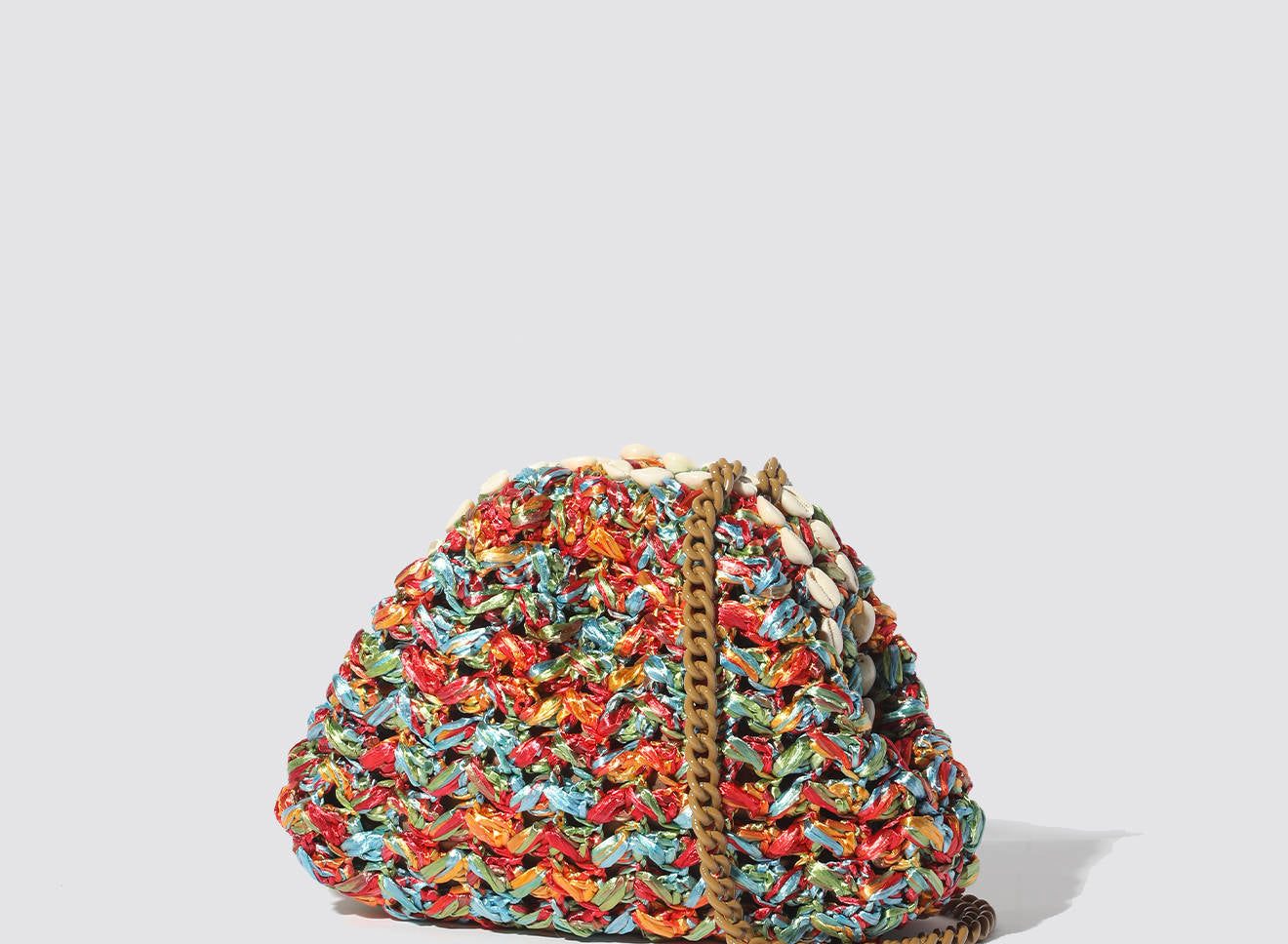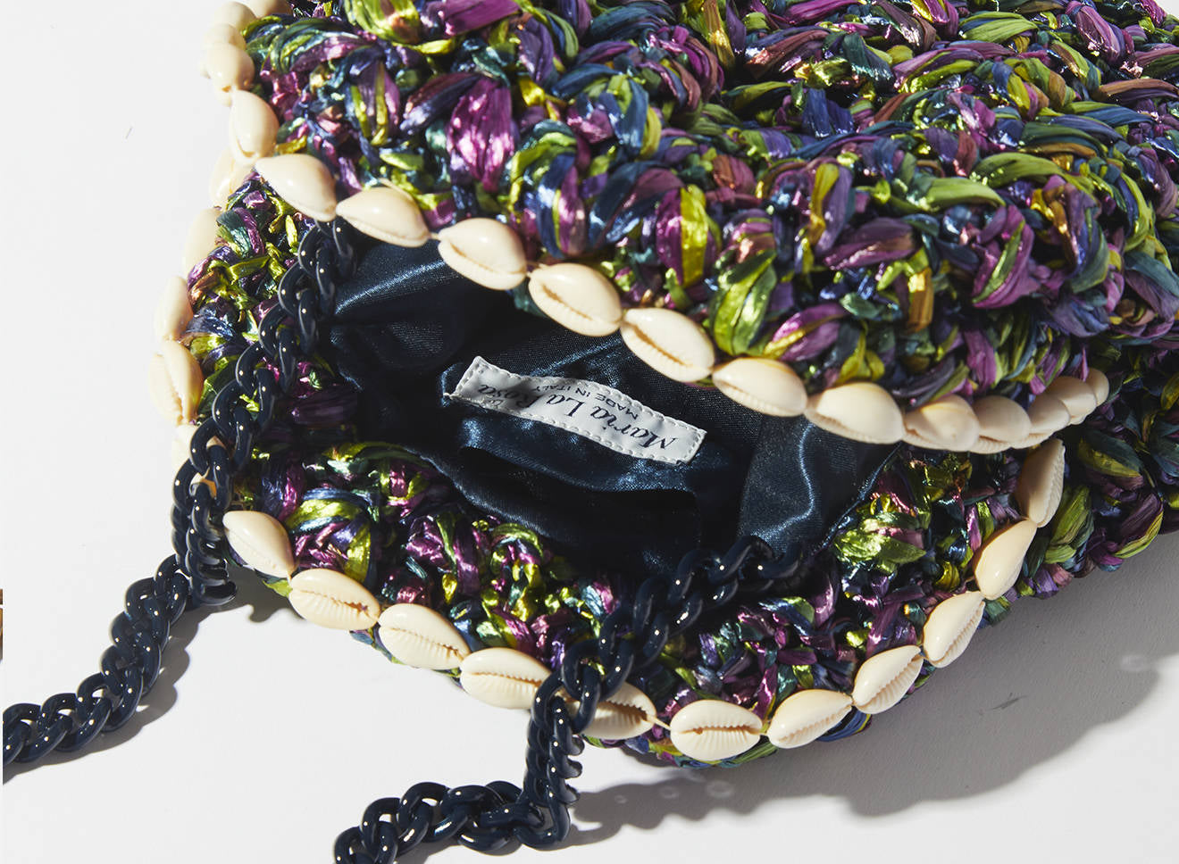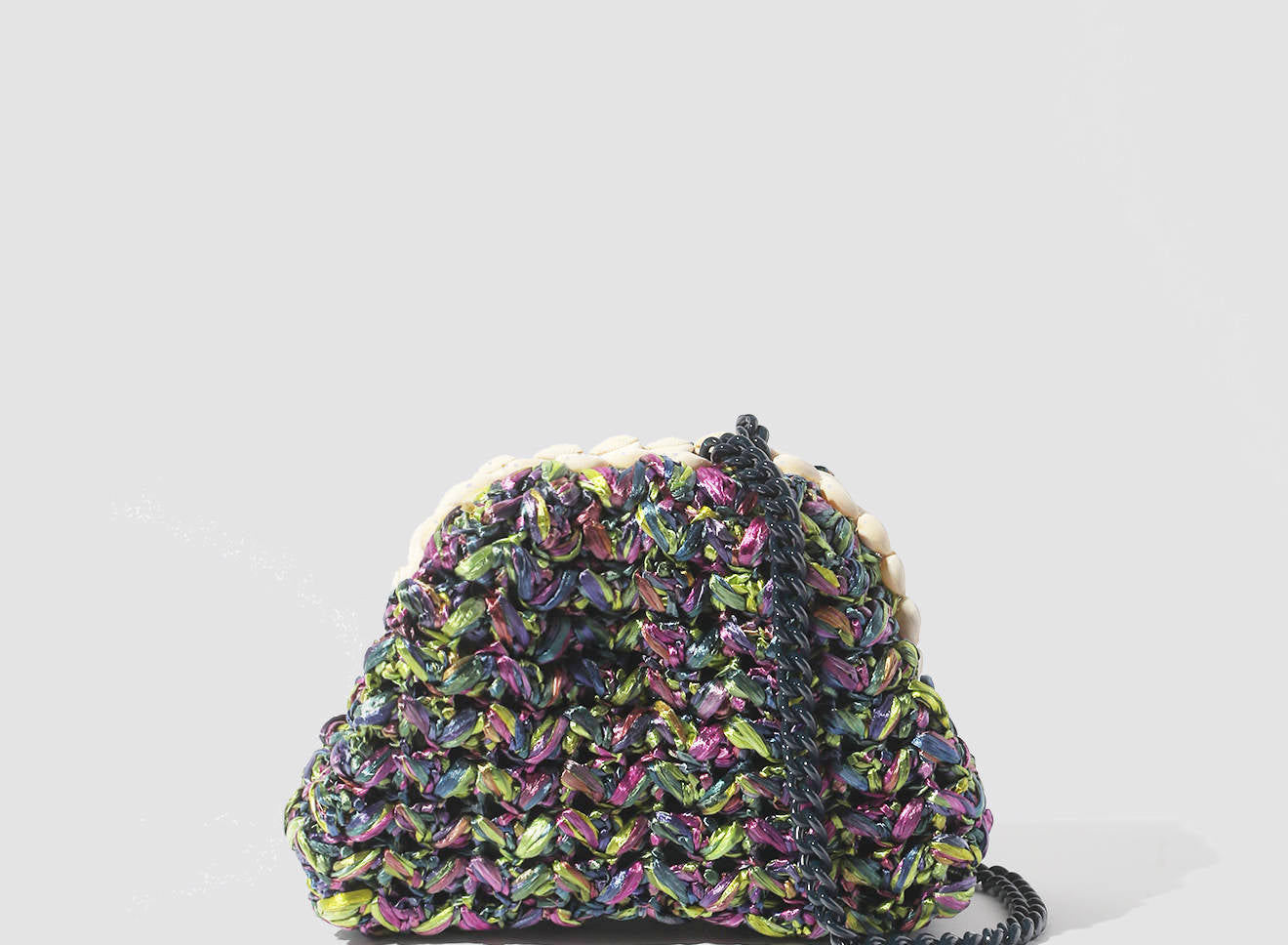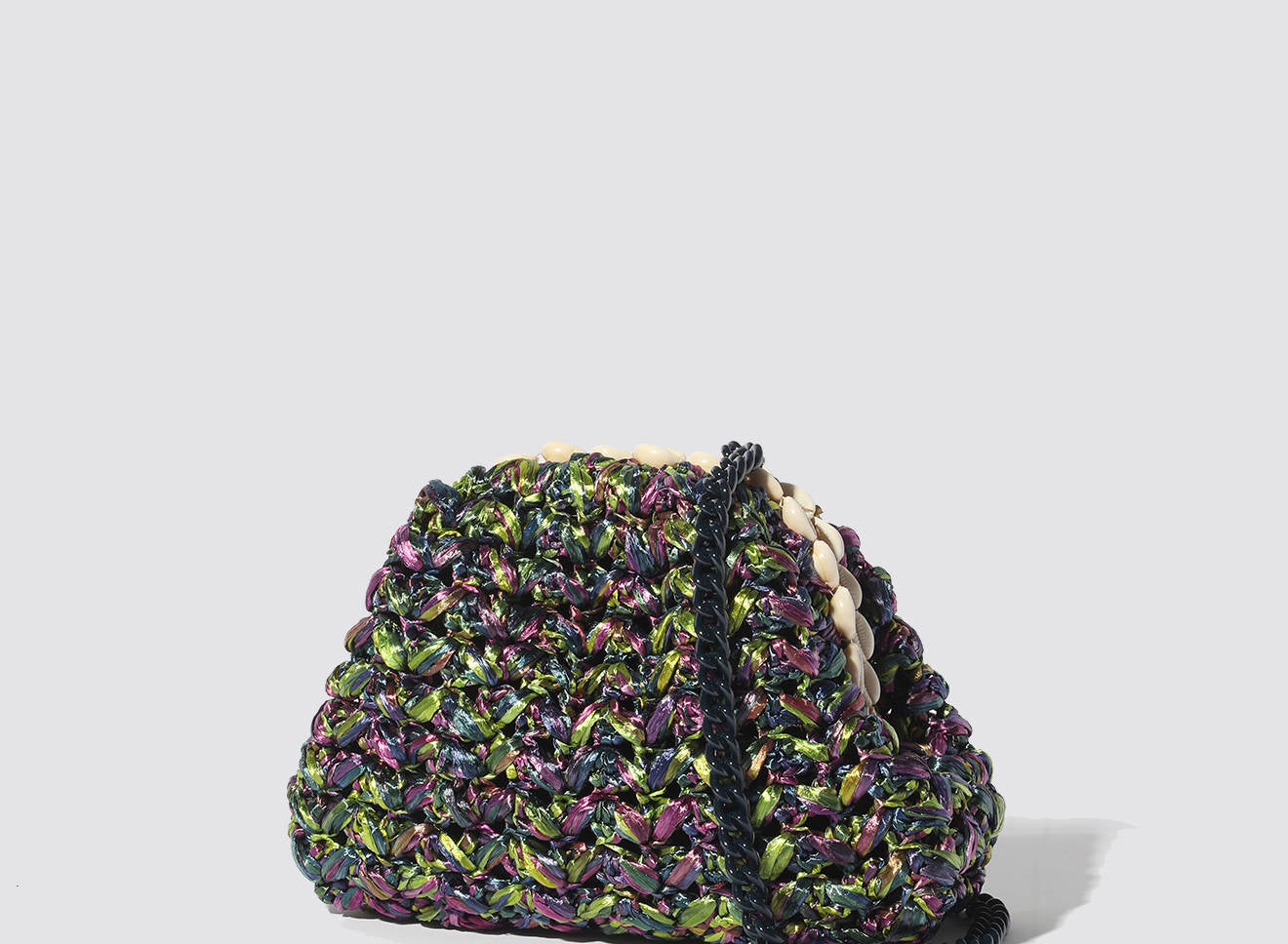 Questa borsa di piccole dimensioni in rafia lavorata a maglia è un piccolo gioiello di artigianato italiano. Il design unico è valorizzato da una raffinata decorazione con conchiglie naturali, che aggiungono un tocco esotico e sofisticato all’insieme. La trama morbida e irregolare, ottenuta con la tecnica del tricot, mette in risalto un vivace mix di colori e accenti iridescenti, che conferiscono profondità e personalità all’accessorio.