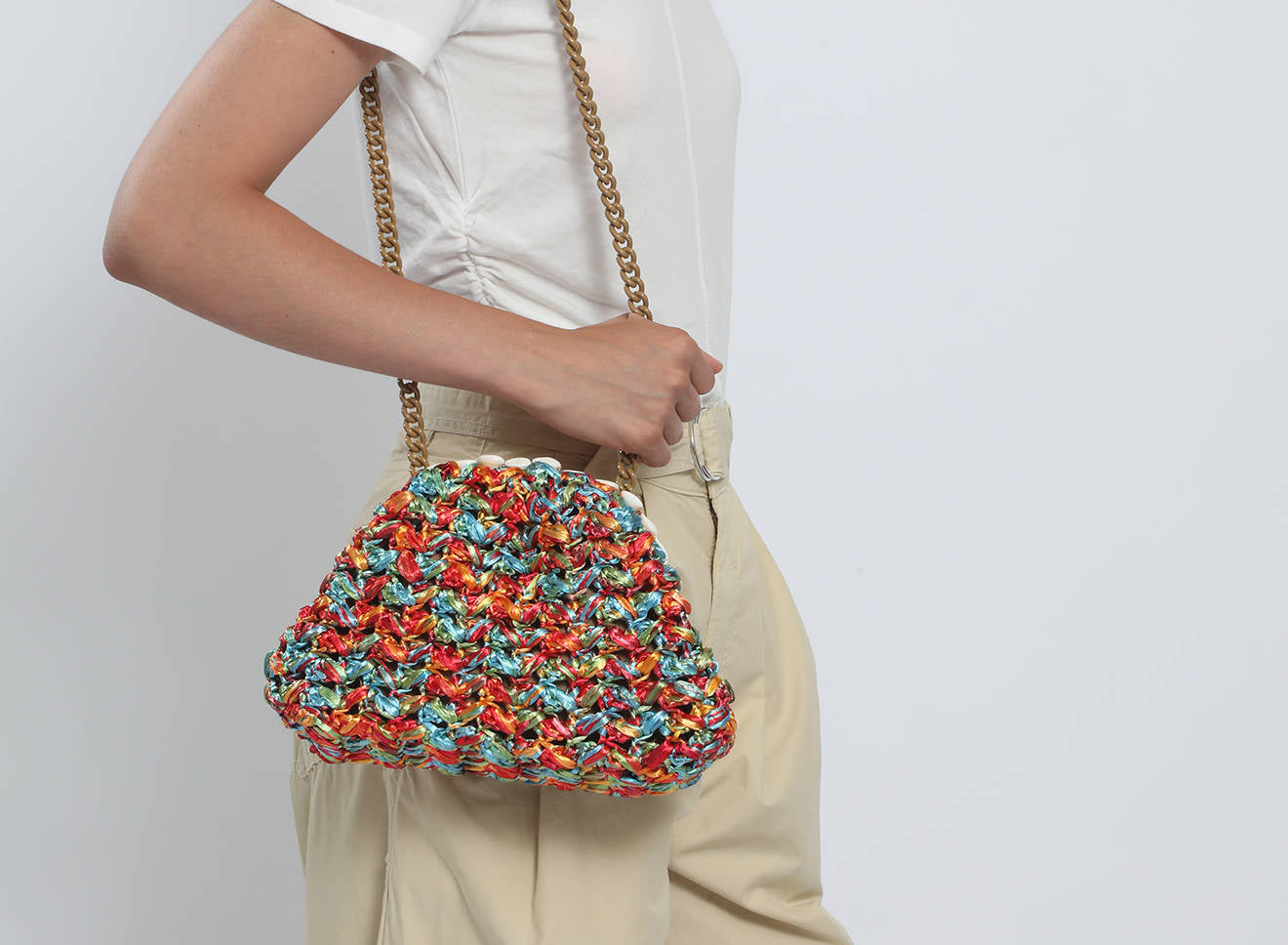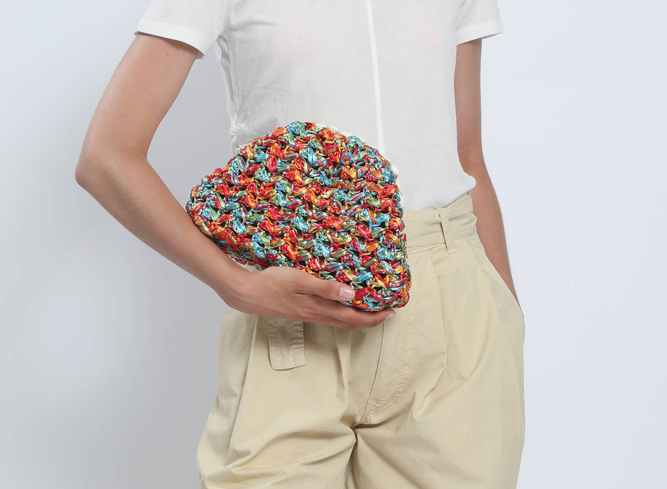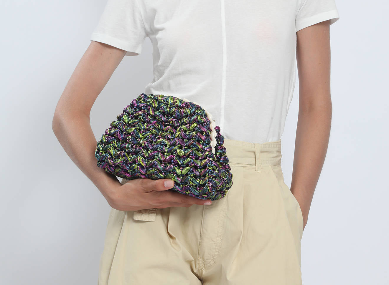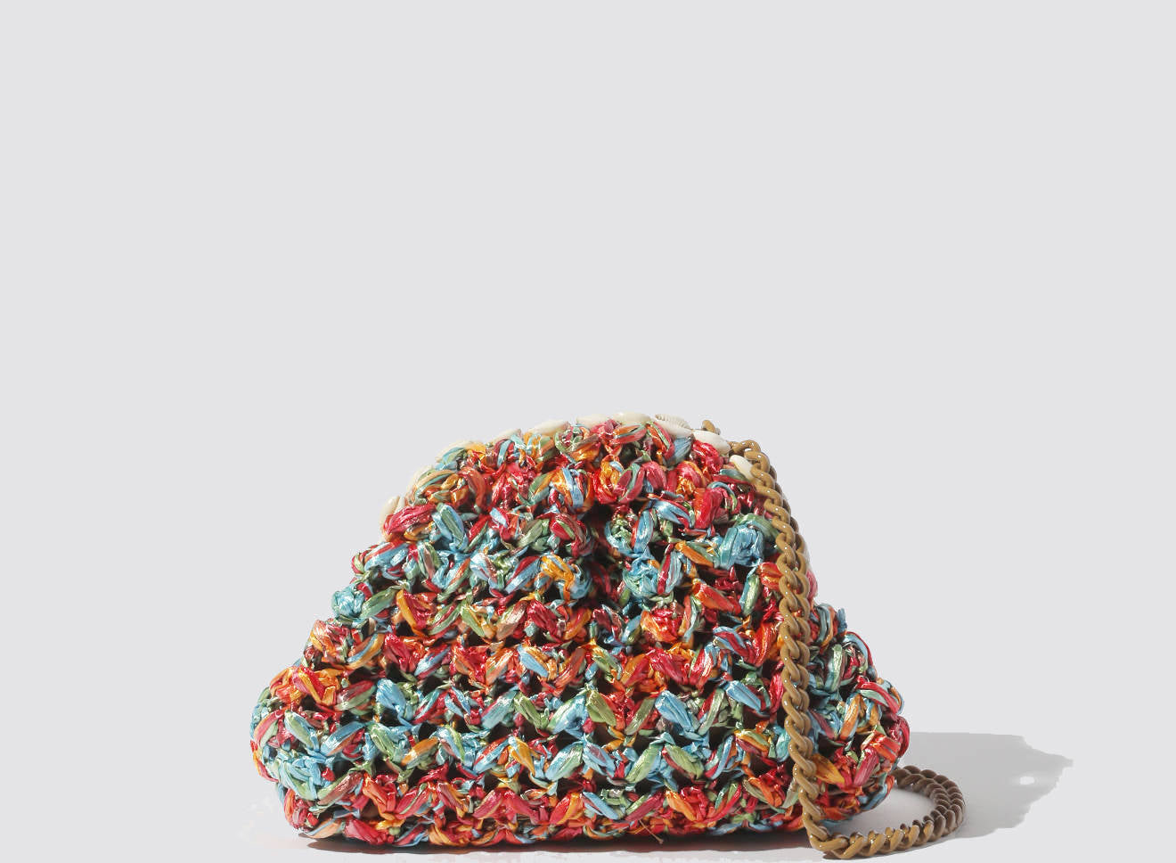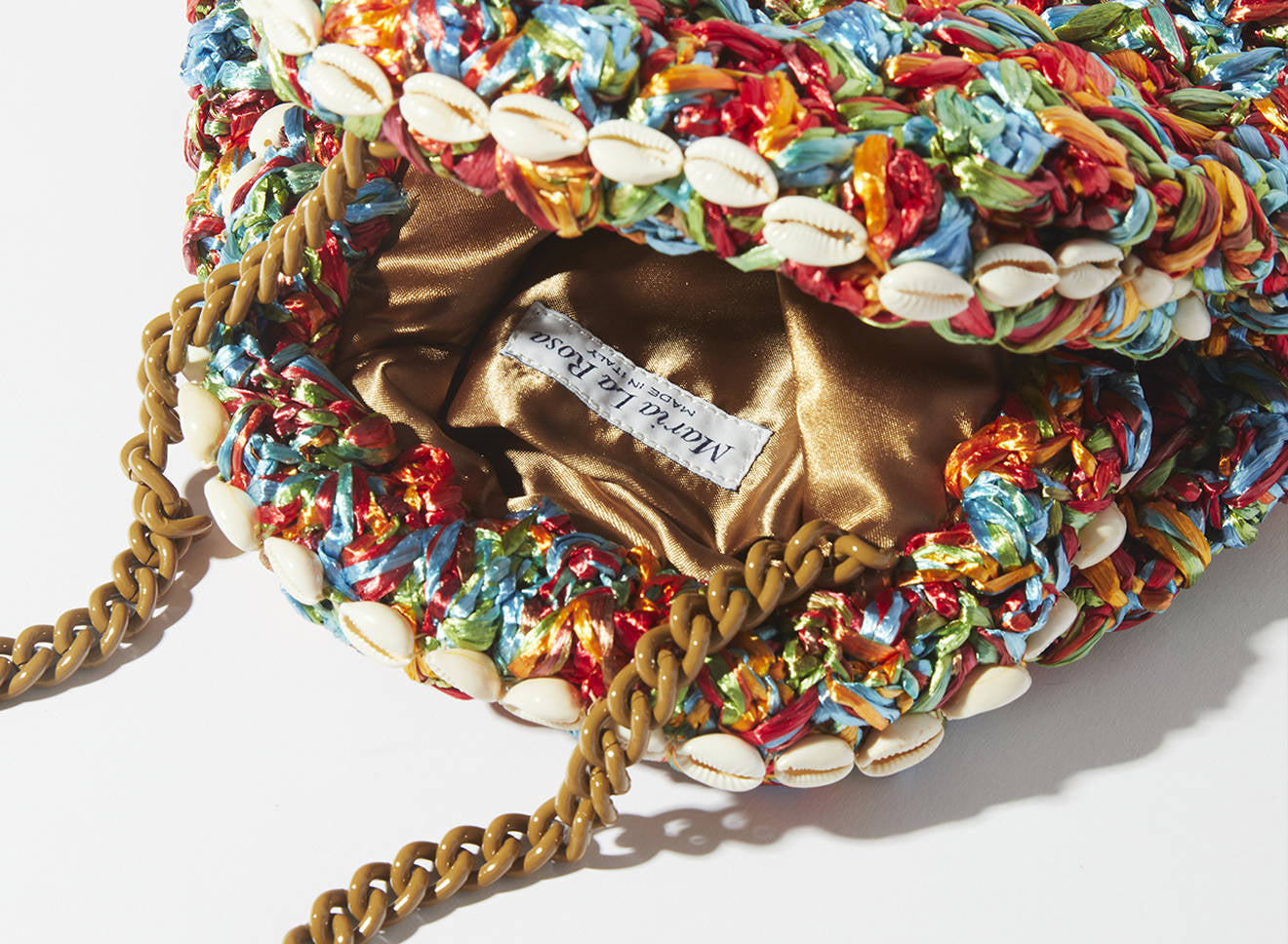 Questa borsa di piccole dimensioni in rafia lavorata a maglia è un piccolo gioiello di artigianato italiano. Il design unico è valorizzato da una raffinata decorazione con conchiglie naturali, che aggiungono un tocco esotico e sofisticato all’insieme. La trama morbida e irregolare, ottenuta con la tecnica del tricot, mette in risalto un vivace mix di colori e accenti iridescenti, che conferiscono profondità e personalità all’accessorio.
