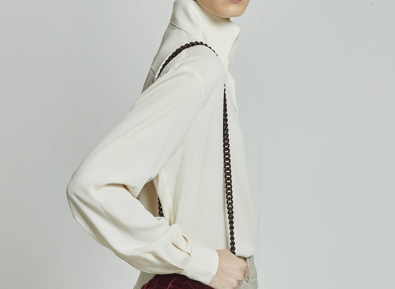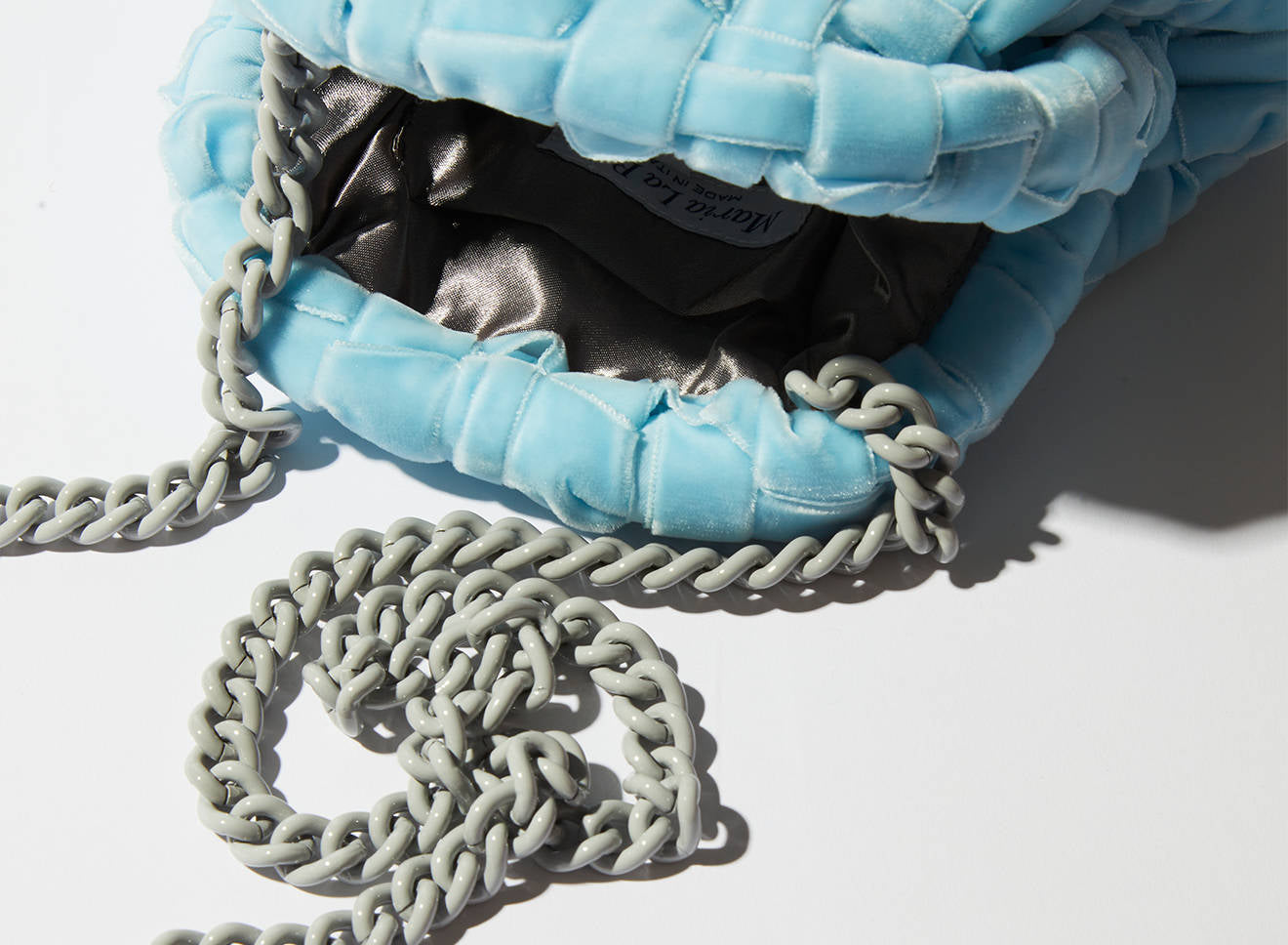 È dotata di catena ton sur ton per indossarla anche a tracolla e tante sono le varietà cromatiche tra cui poter scegliere. Interamente disegnata e prodotta in Italia.