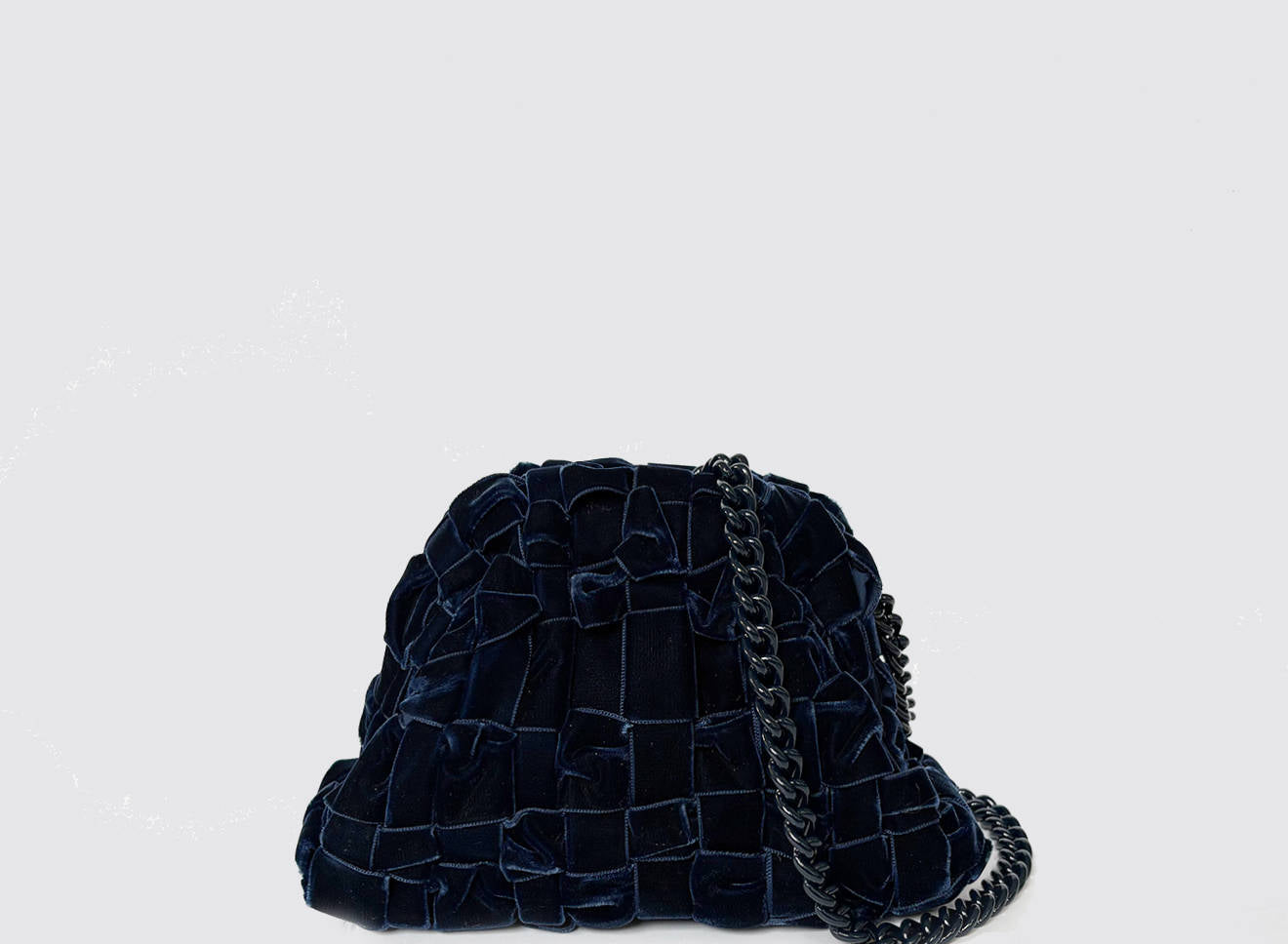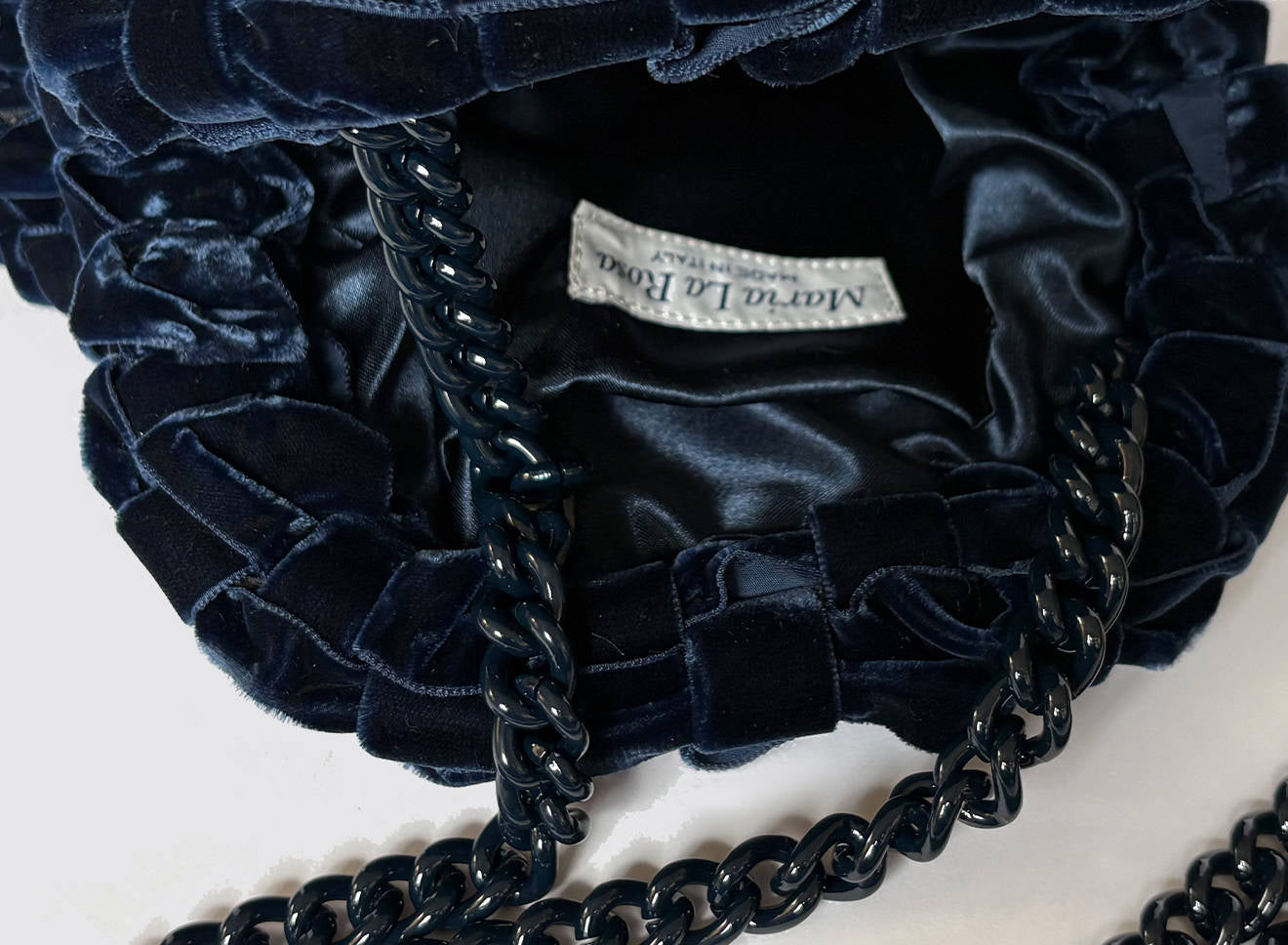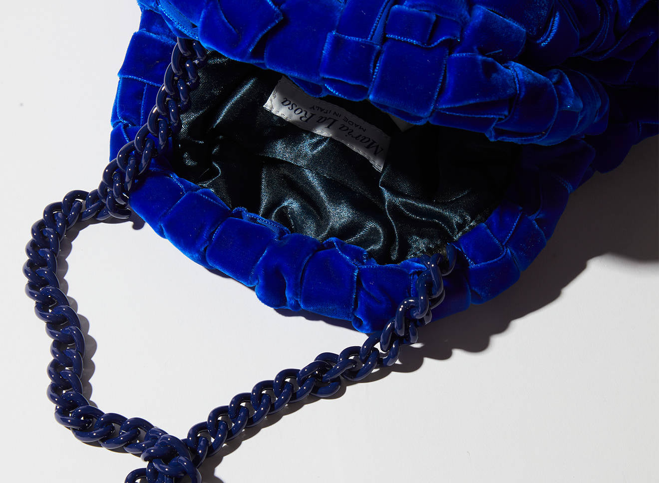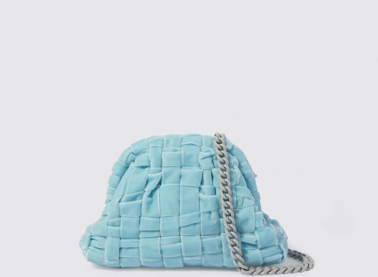 Clutch da donna di piccole dimensioni in tessuto di nastro di velluto intrecciato, realizzato a mano su antichi telai. Questo modello costituisce l’icon bag Maria La Rosa, perfetta per la stagione invernale, emblema di una nuova eleganza metropolitana, che assicura capienza e funzionalità.