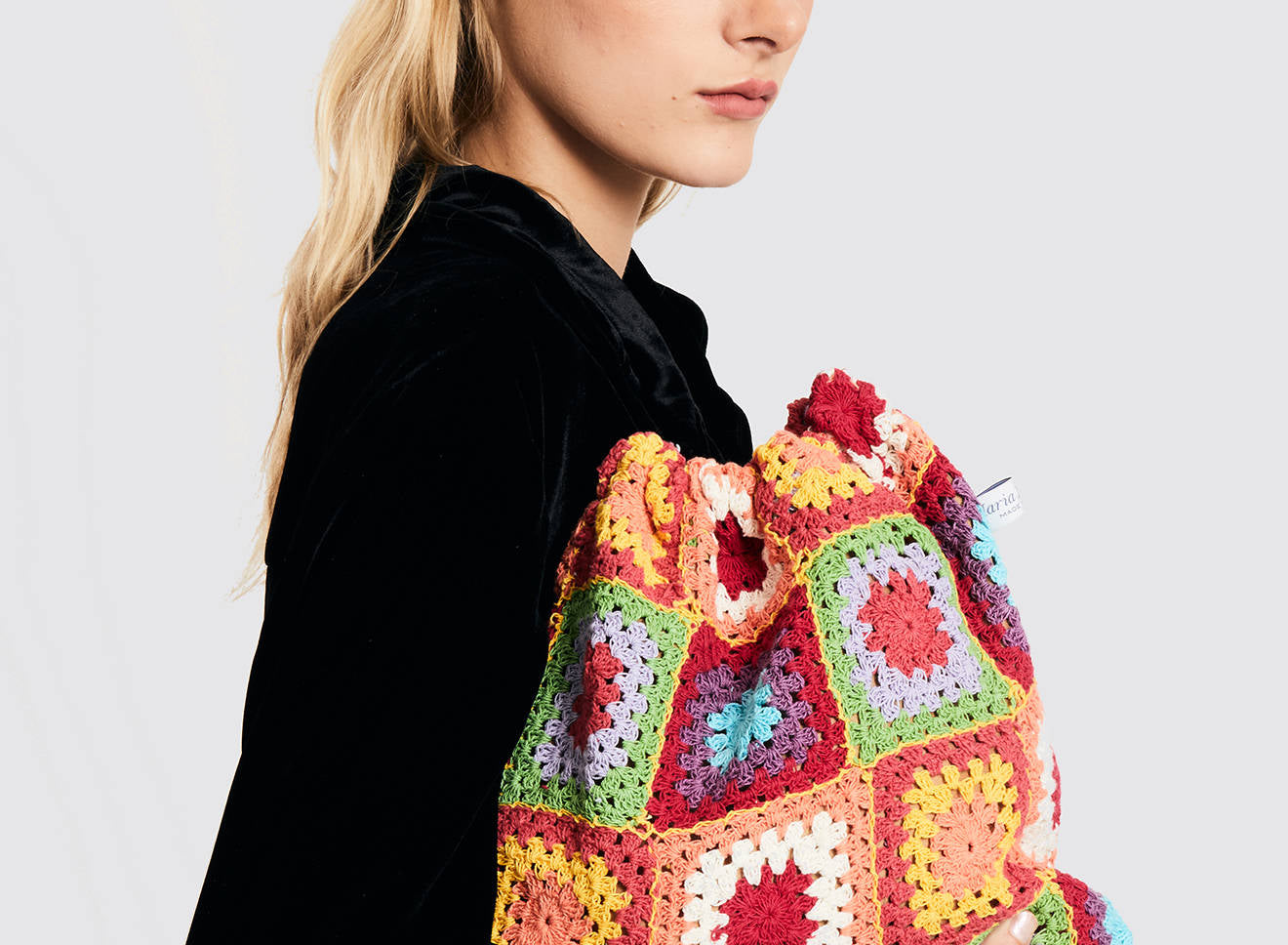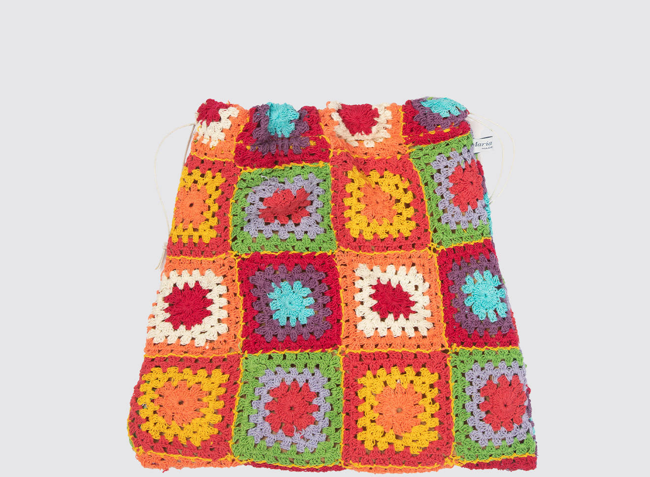 Sacchetto di medie dimensioni realizzato in cotone. Caratterizzato da un patchwork di coloratissimi quadrati realizzati con tecnica crochet. Disponibile in due varianti.