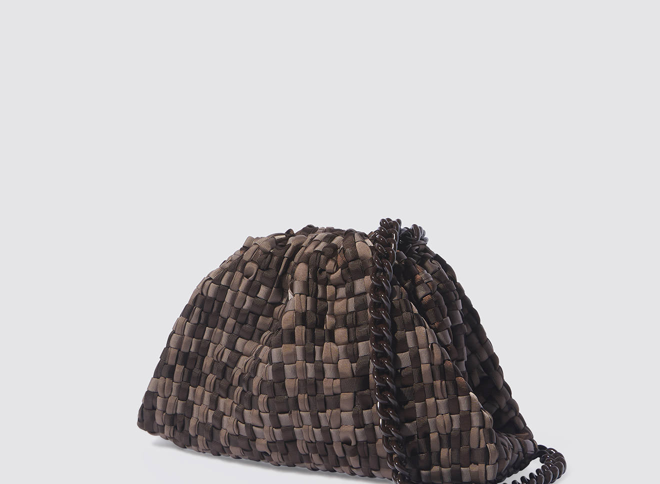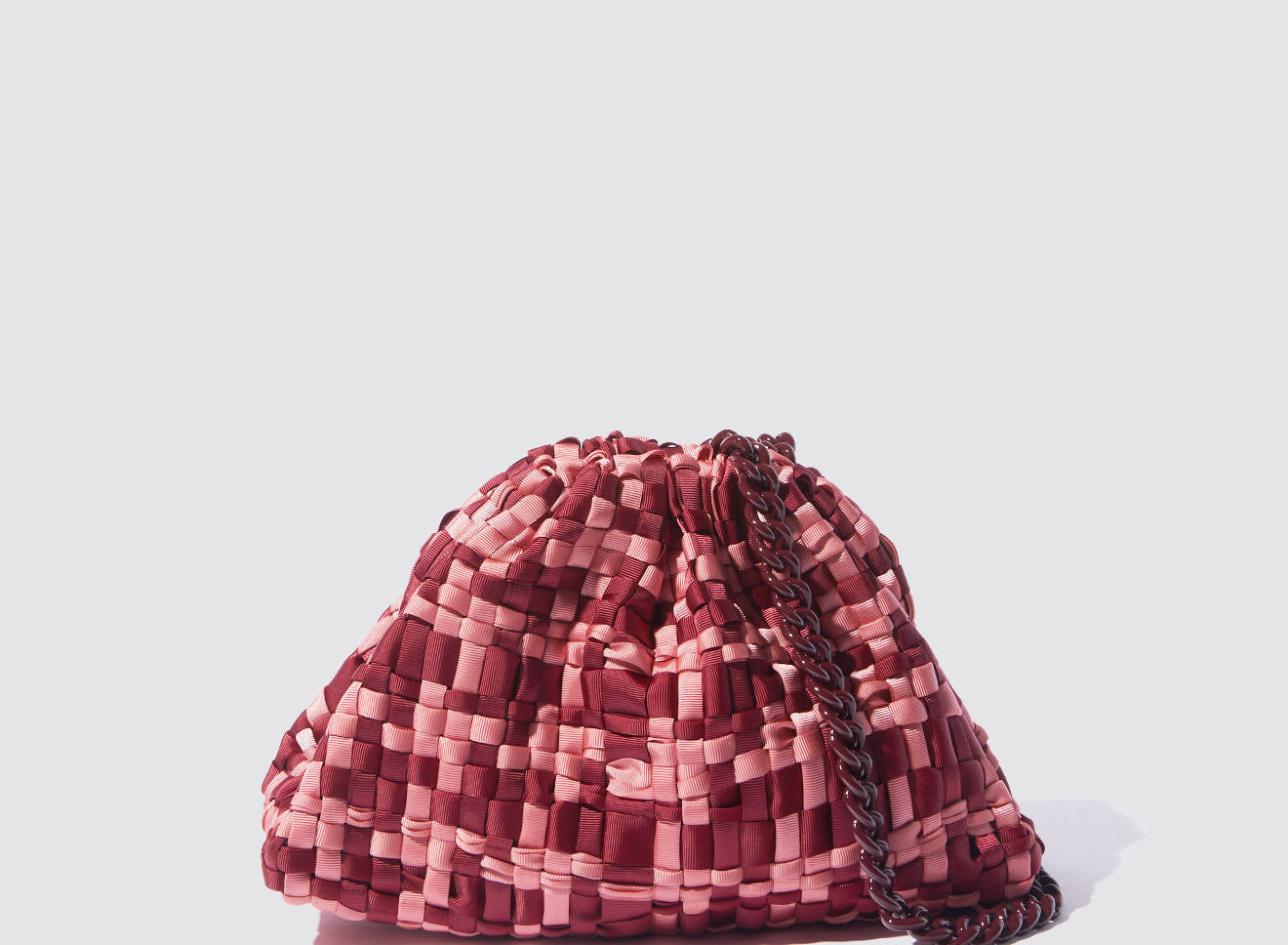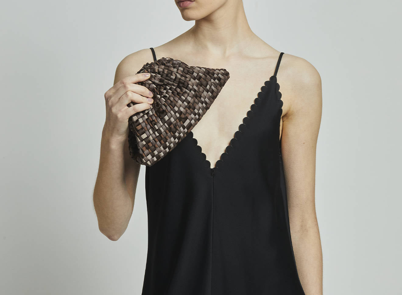 Clutch da donna di piccole dimensioni in tessuto di nastro intrecciato, realizzato a mano su antichi telai con fantasia vichy. Questo modello costituisce l’icon bag Maria La Rosa, perfetta per tutte le stagioni, emblema di una nuova eleganza metropolitana, che assicura capienza e funzionalità.